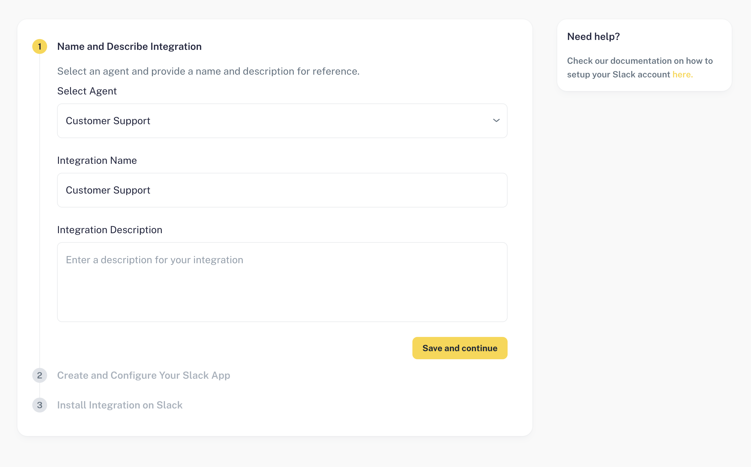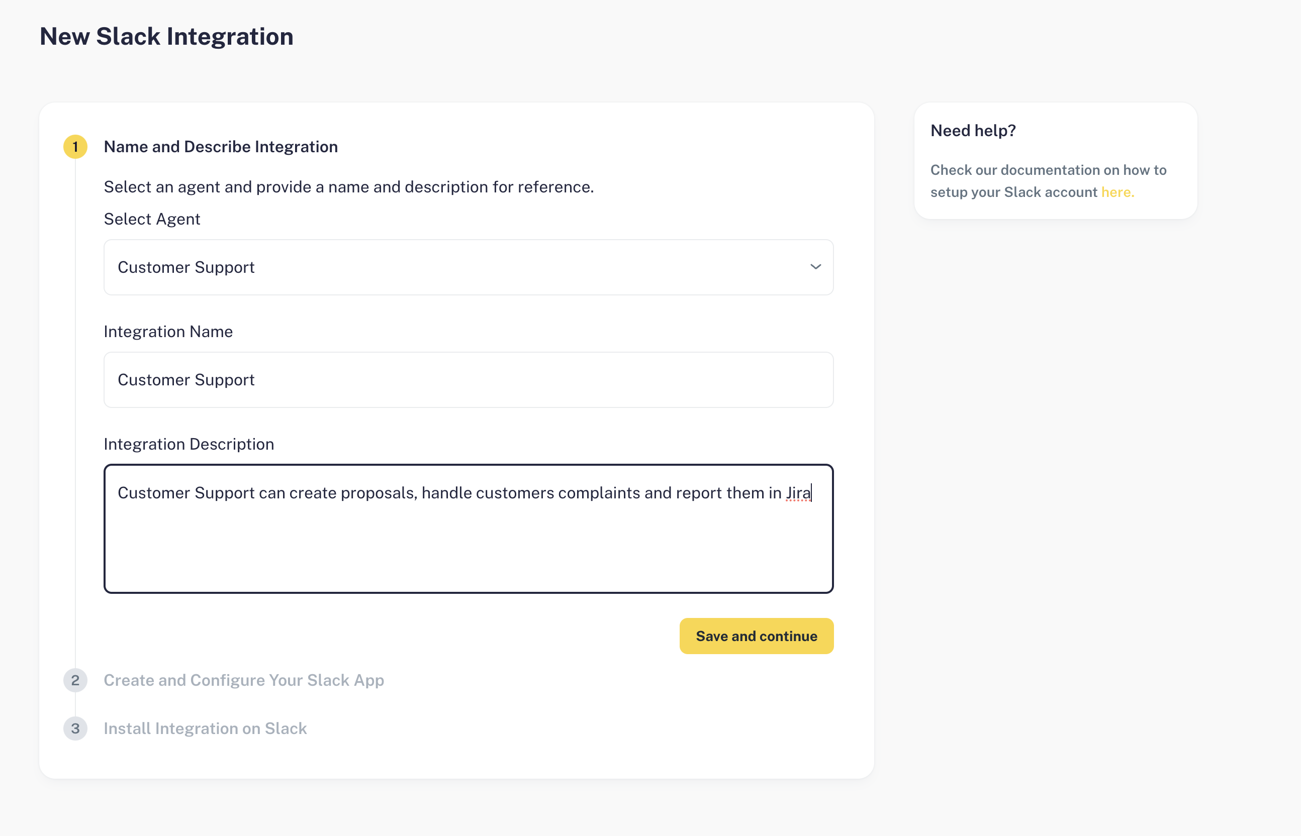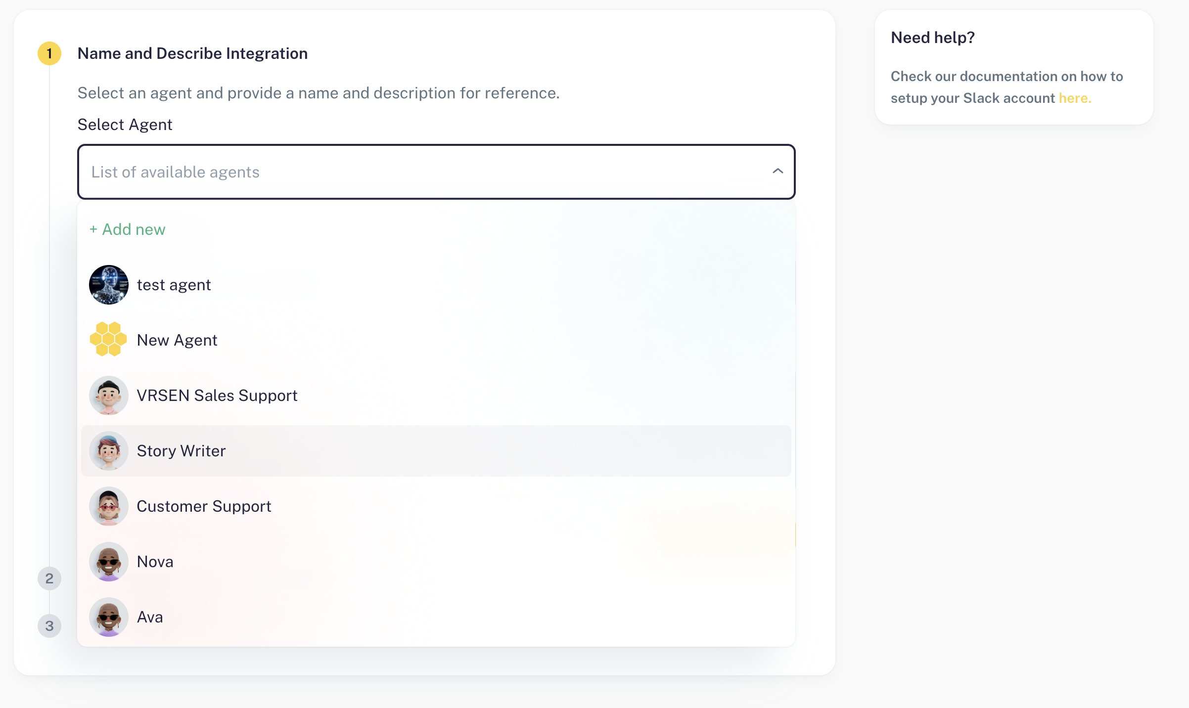 Select Your Agent: Select the agent to be integrated into your slack app. This agent will be used to generate responses.