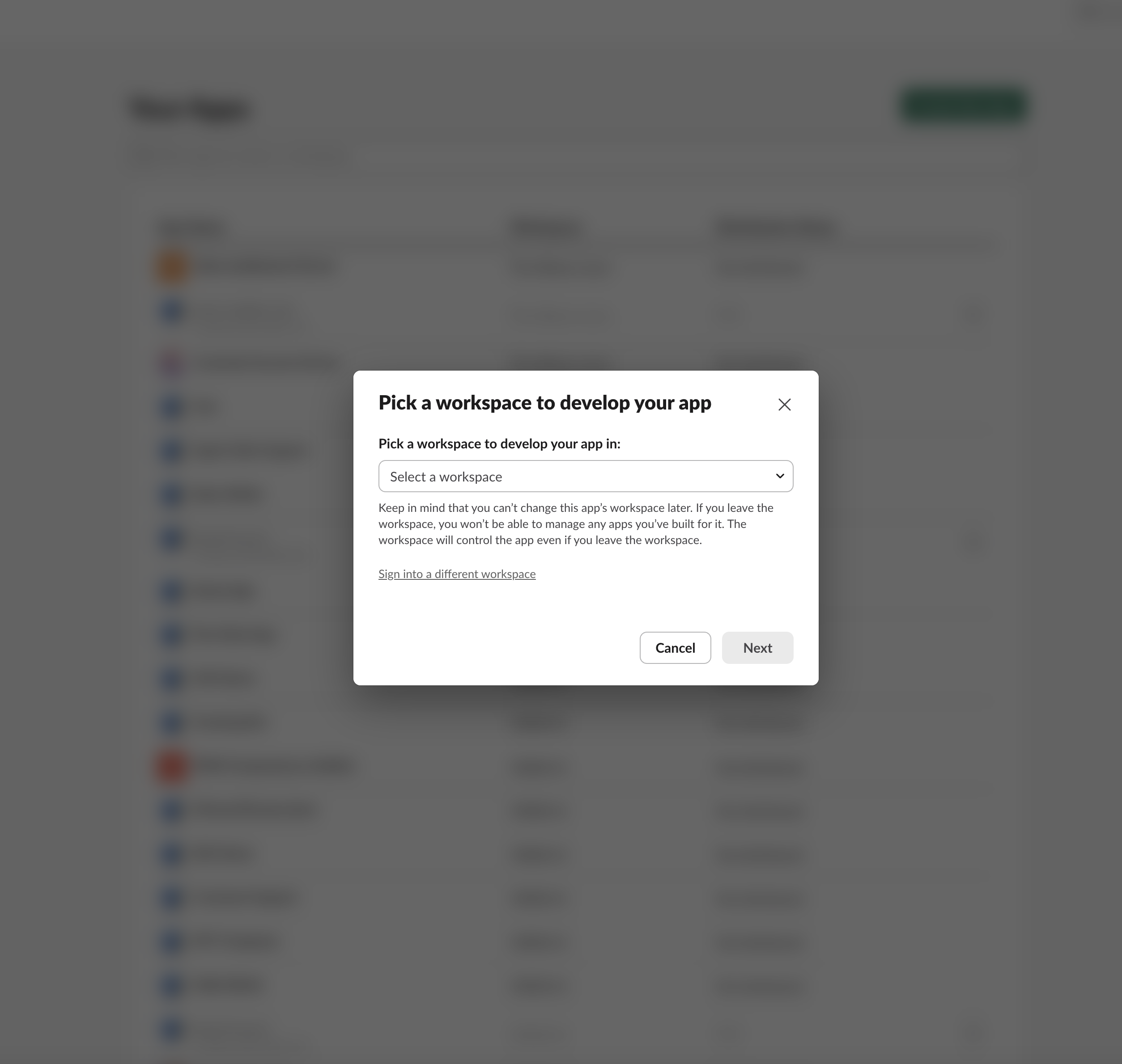 api.slack.com), where you will need to authenticate and select the correct workspace for your application.