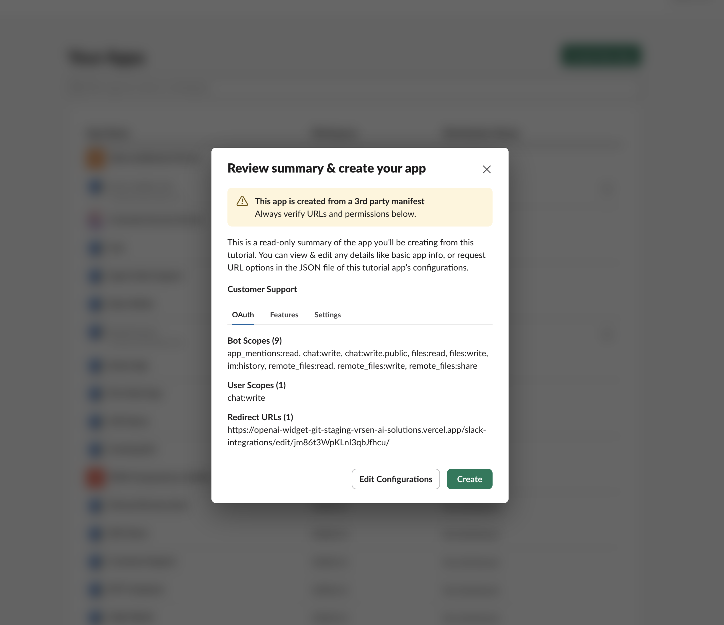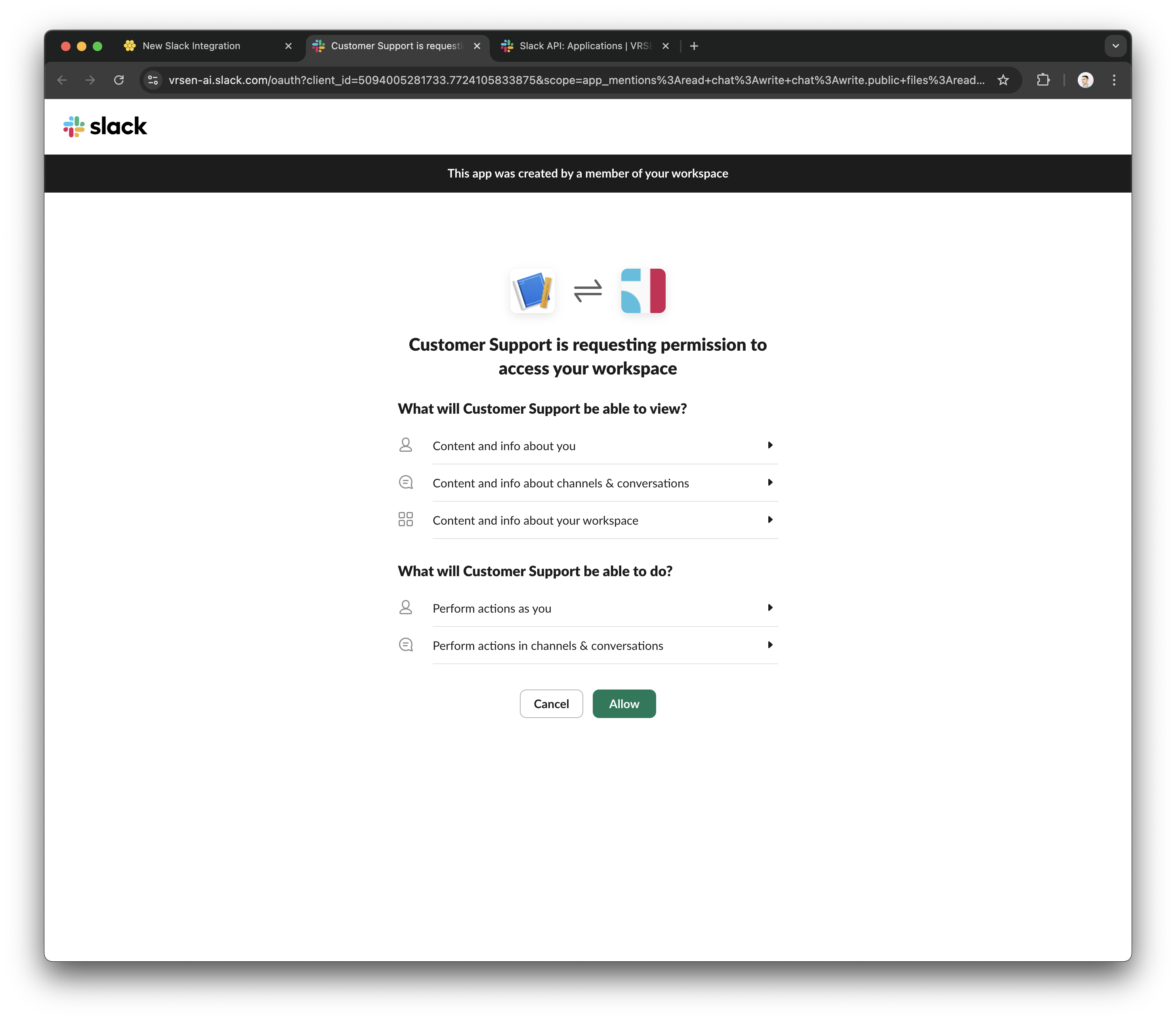 Grant Permission: Slack will prompt you to grant permission to exchange the OAuth token. Click “Allow” to sync your app with the integration.