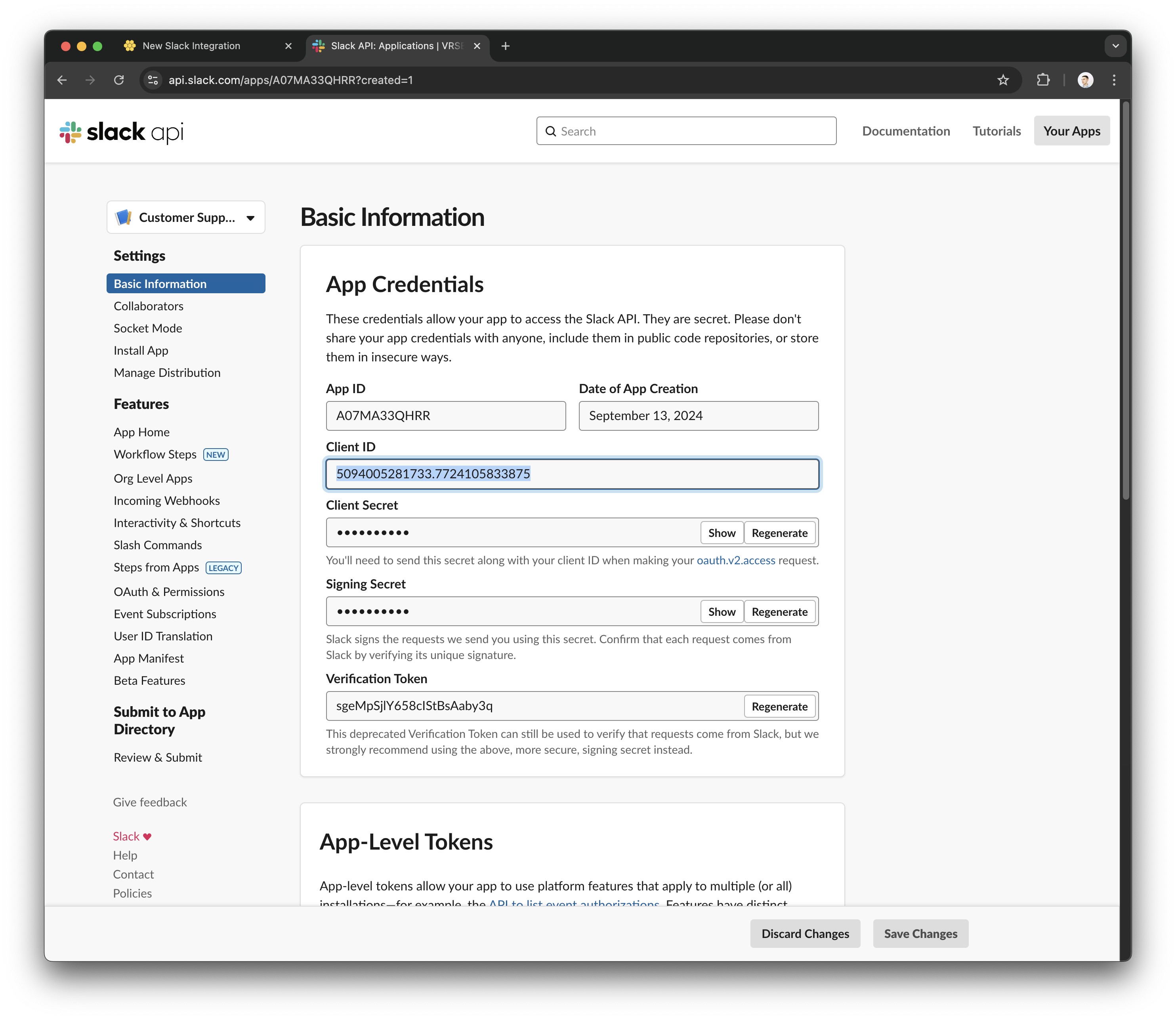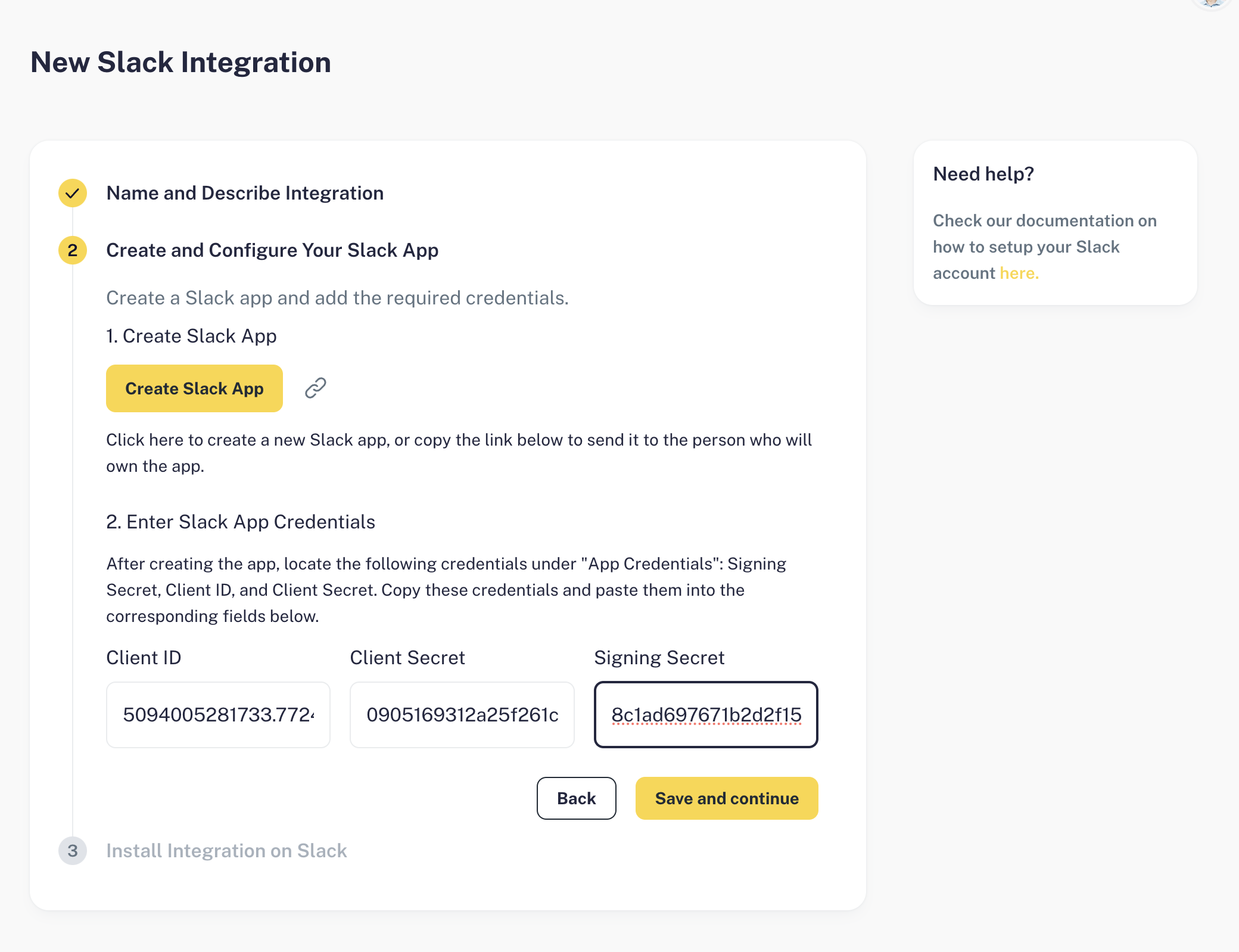 Copy credentials: Copy your client id, client secret and signing secret, and paste them into the corresponding fields