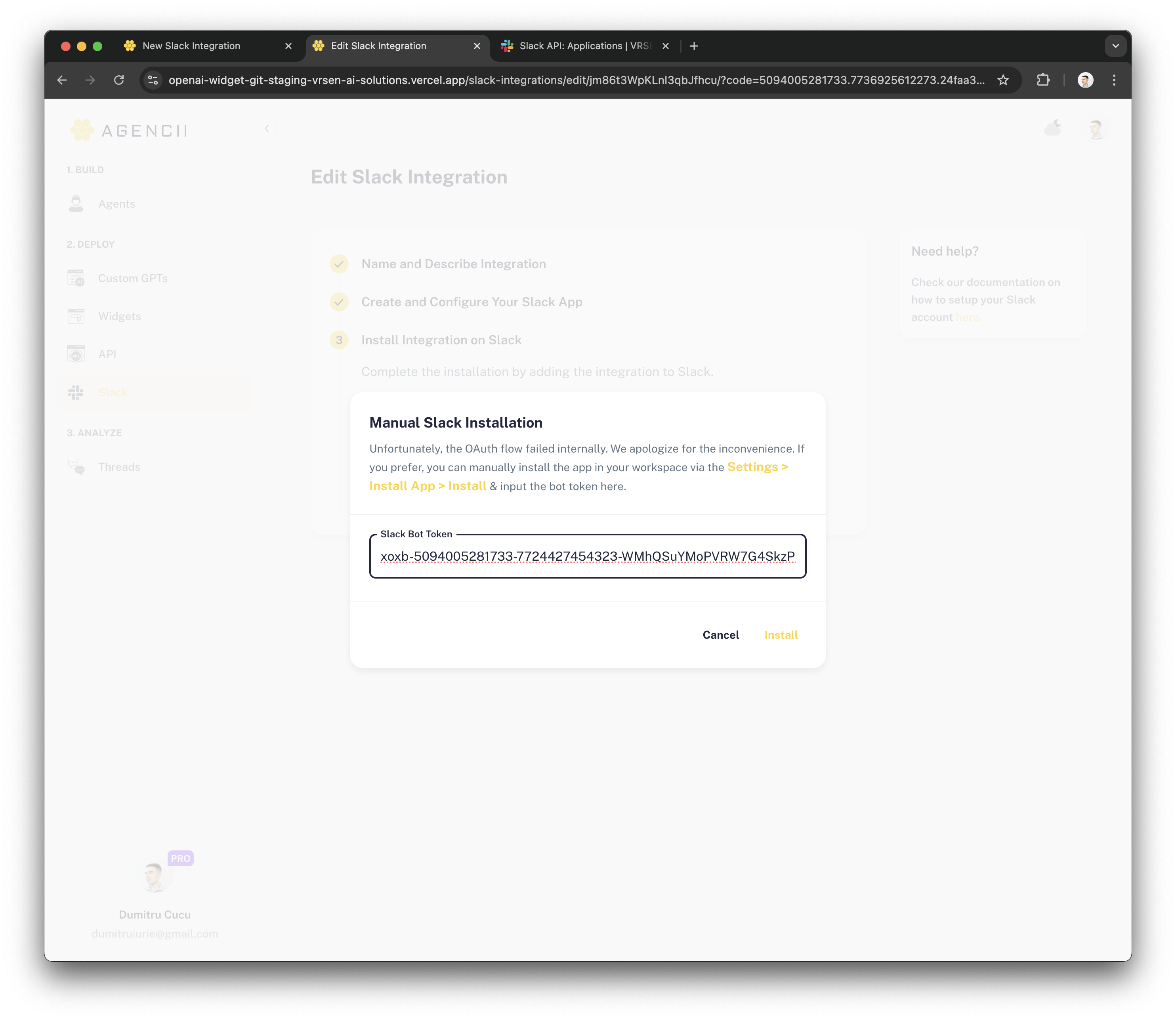 If the automatic OAuth flow fails, you can manually install the app.- Find your Bot User OAuth Token in your app on api.slack.com.